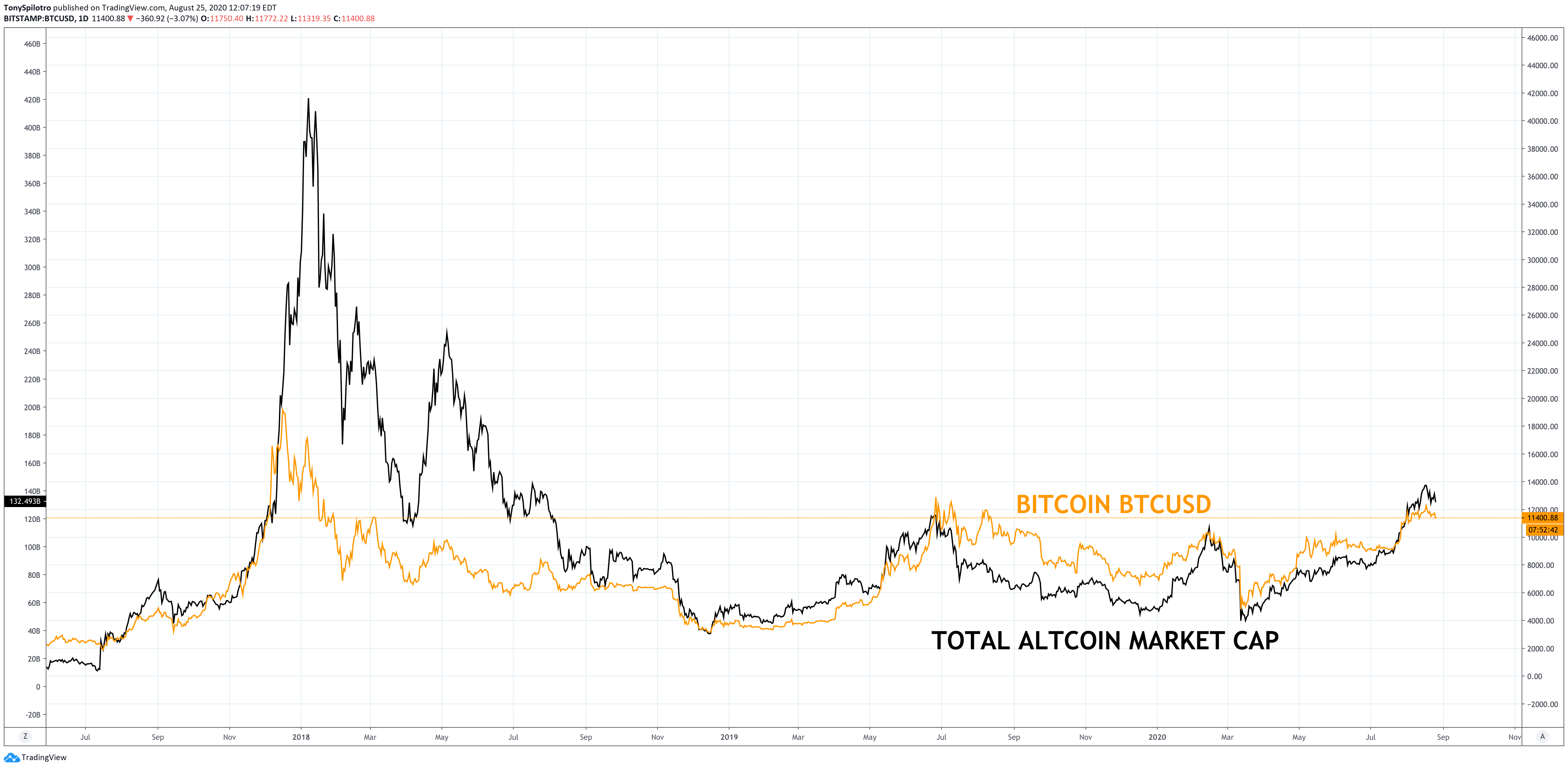 BTCUSD Versus CryptoCap-Total 2 (Total Altcoin Market Cap) Chart Comparison | Source: TradingView