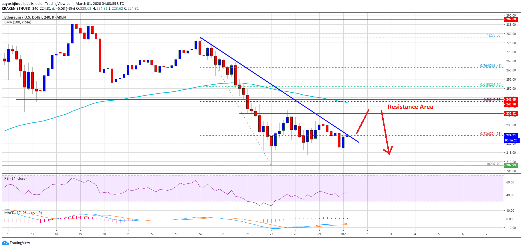 Ethereum decline to a new 3-week low at $208 against the US Dollar, similar to bitcoin. ETH price could correct higher in the short term, but upsides are likely to remain capped near $242.