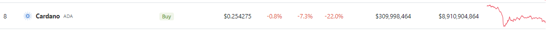 Altcoins, including Cardano’s ADA, have been significantly affected by Bitcoin’s downturn. ADA, currently priced at $0.259126 at CoinGecko, has experienced a 7.3% slump in the past 24 hours alone, contributing to a substantial seven-day decline of 22%. These figures illustrate the strong correlation between Bitcoin’s price movements and the performance of altcoins.