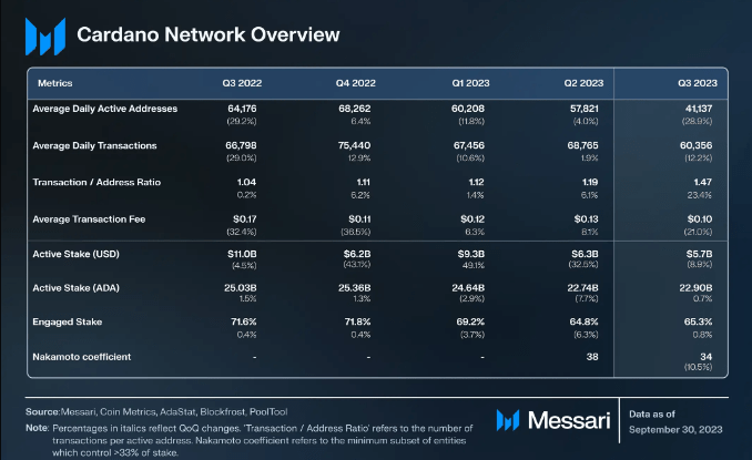 In the realm of cryptocurrencies, metrics play a crucial role in determining the health and vitality of a blockchain network. Cardano’s performance in Q3, as shown in Messari’s analysis, revealed some concerning trends, albeit not entirely bleak. The average transaction fee on the Cardano network, denominated in US dollars, saw a 29.9% decrease, dropping from $0.13 to $0.10, suggesting a reduction in the cost of network usage.