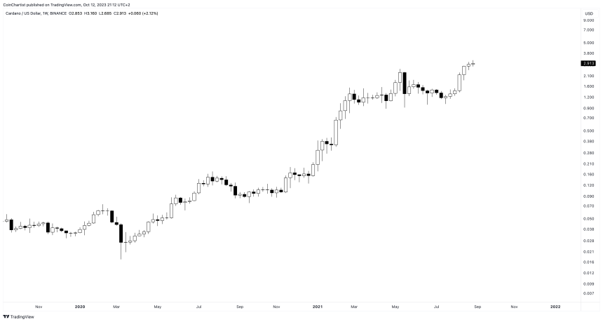 Cardano’s all-time high price was $3.10 reached in September 2021 at the peak of the crypto bull run.