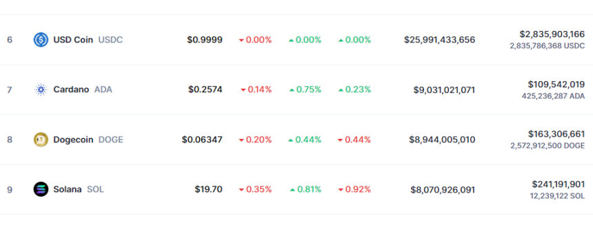 However, the gap between ADA and the 8th place Dogecoin (DOGE) is down to less than $100 million now, meaning that the asset is at risk of dropping down from its spot.