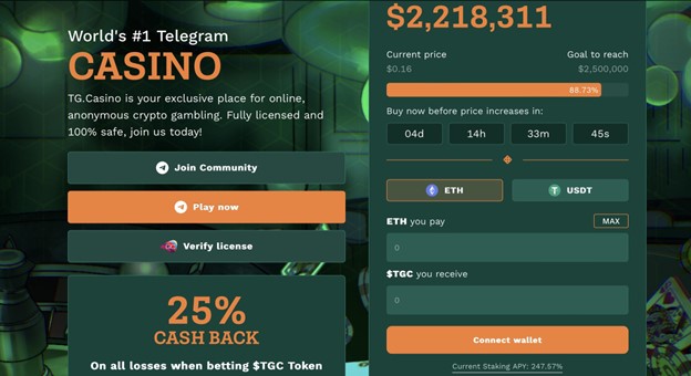TG.Casino’s native token – $TGC – is currently in its presale phase, where it has already raised over $2.2 million in just over a month. Players choosing to bet with $TGC will receive a 25% cash back on all their losses, along with exclusive access to several games.