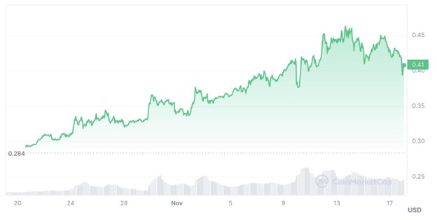 According to CoinMarketCap, $SAND is the fourth-largest gaming token, with a market cap of over $850 million. Despite plunging 4% over the past 24 hours, the token continues to trade above the $0.40 support, up 41% in the past month.