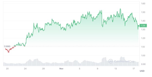 Despite a 6% depreciation today, the token is up 20% over the past month. More importantly, it continues to hold above the crucial $1.30 support, which keeps its bullish scenario in play.