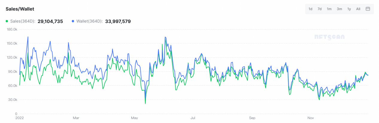 According to NFTScan, as of December 31, 2022, the total number of NFT transactions on Ethereum hit 29,104,735, with roughly 33,997,579 active wallets. Both figures saw a growth rate of over 200% YoY.