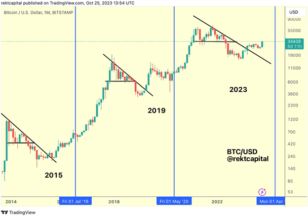 Bitcoin is currently priced at $34.5K, up 1.7% in the last 24 hours, 22% this week and 67% this year. Such bullish momentum is surprising, considering it usually pumps following its 4-yearly halving, which will next occur in April 2024.