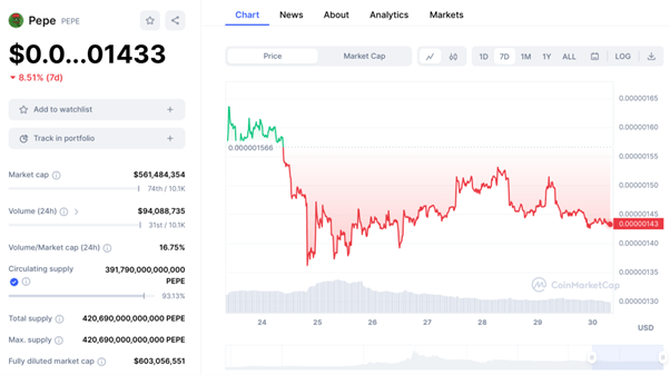 Pepe 7-day price overview, 30 May 2023, CoinMarketCap