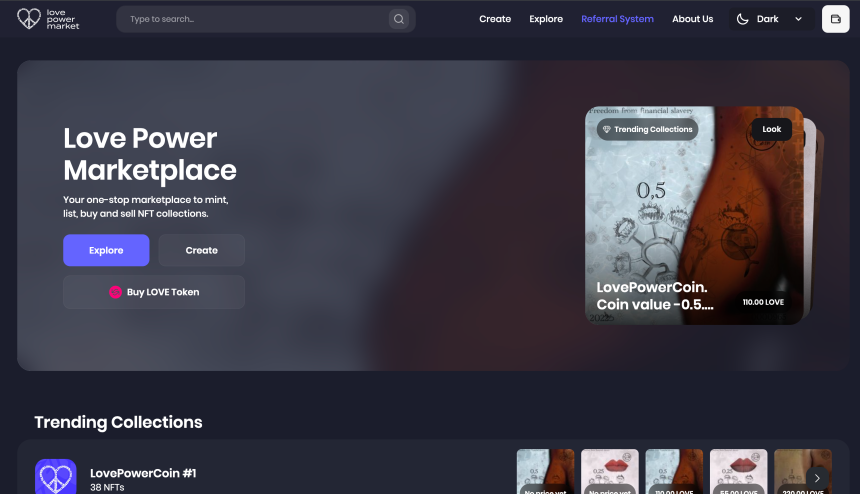 Currently, Love Power Marketplace offers services for buying and selling non-fungible tokens (NFTs) from its own collection, as well as collections from other creators. Purchases can be made with LOVE tokens, which are the internal currency for the entire ecosystem.