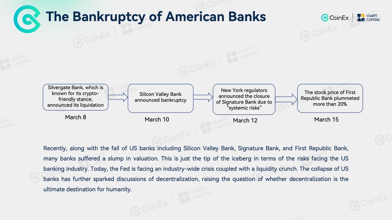 Recently, along with the fall of US banks including Silicon Valley Bank, Signature Bank, and First Republic Bank, many banks suffered a slump in valuation. This is just the tip of the iceberg in terms of the risks facing the US banking industry. Today, the Fed is facing an industry-wide crisis coupled with a liquidity crunch. The collapse of US banks has further sparked discussions of decentralization, raising the question of whether decentralization is the ultimate destination for humanity.