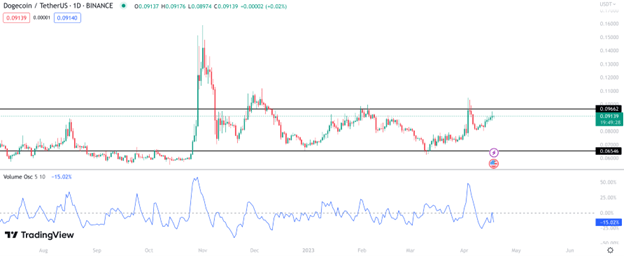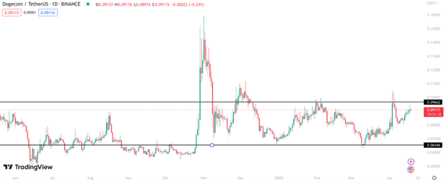 The key levels of support and resistance are the first things to consider when breaking down the charts. The chart below shows that DOGE is still trading within its 2023 range. The price has yet to break out, making it uncertain whether the coin is ready to surge to $0.20 or higher.