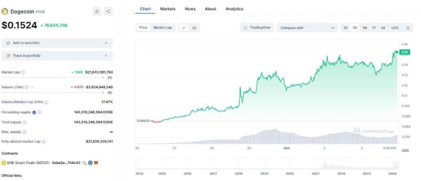 The price of Dogecoin has exhibited a notable uptrend, recently establishing the ascending trendline as a support following a significant bullish candle recorded on March 1. With continued adherence to this trendline, there is potential for DOGE price to witness further upward movement. Should buying pressure intensify beyond current levels, there is a possibility for the largest meme coin by market capitalization to reclaim the $0.1510 range high, representing a nearly 7% increase from current levels. This has a very positive effect on Dogecoin price prediction.