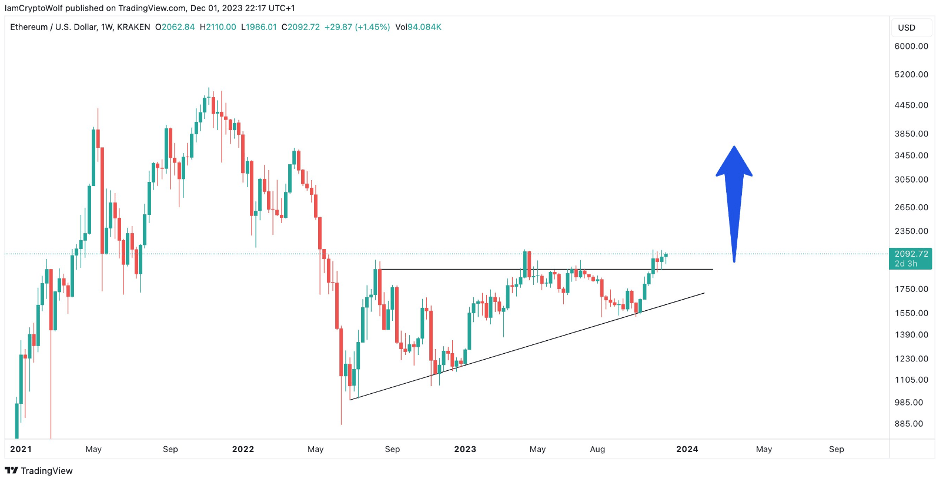 Crypto analyst Wolf recently said, “$ETH is consolidating above an 18-month ascending triangle weekly resistance.”