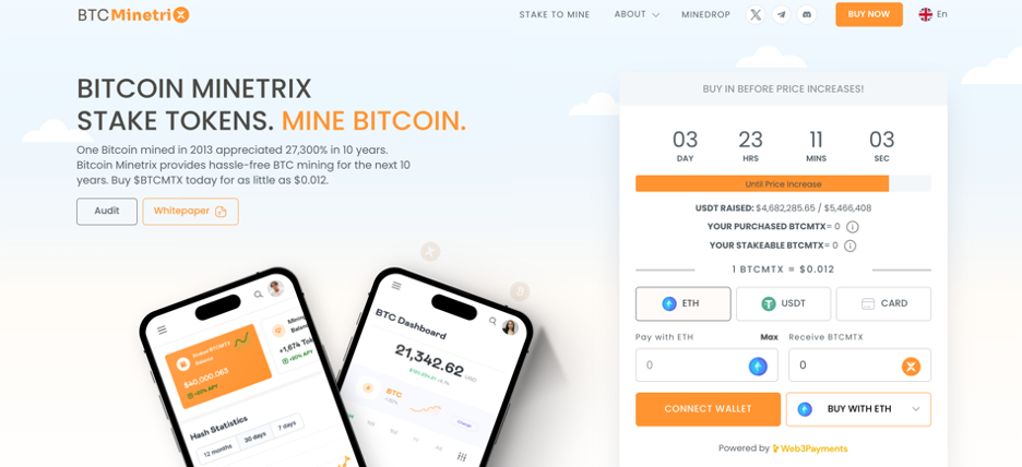 Bitcoin Minetrix is a compelling new cryptocurrency that enables anyone to earn free Bitcoin by staking $BTCMTX on its Ethereum-based platform.