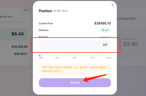 - Enter the CET amount of the bet (range: 10 CET – 10,000 CET per round per address), and click on Submit. After a bet is submitted, it could no longer be modified or canceled.
