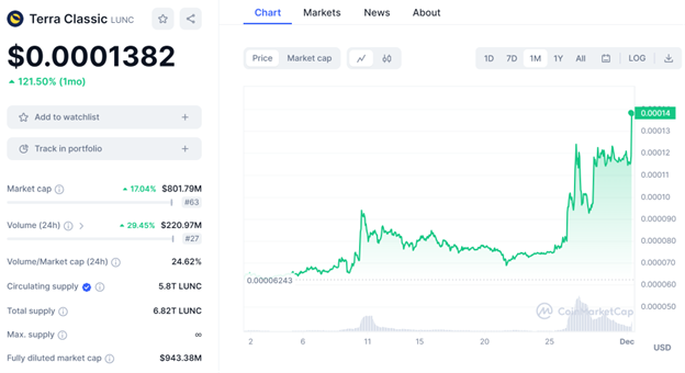 Trading volume in $USTC peaked around the announcement at more than $760 million according to CoinMarketCap. Prior to the announcement, Terra Classic typically experienced trading volume of less than $25 million per day.
