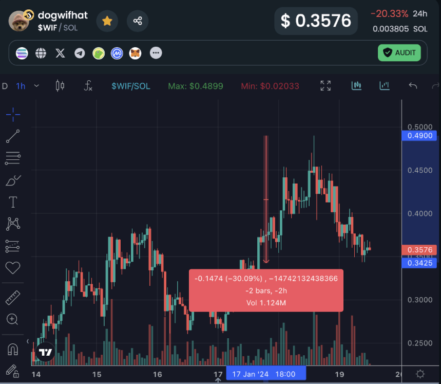 Newly emerging meme coin sensation DogWifHat is also struggling today as it falls 30% from yesterday’s peak.