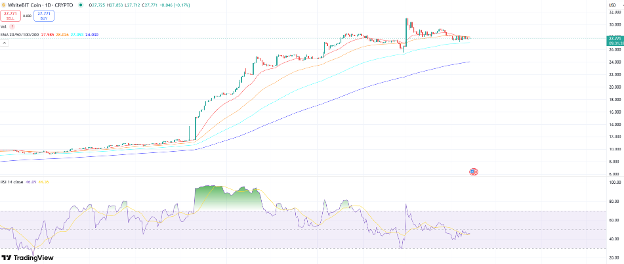 On Saturday, the WBT price faced rejection at the 50-day Exponential Moving Average (EMA), which acts as resistance at $28.03, which coincides with the daily resistance level. At the time of writing on Monday 1414 hours (UTC), the price trades around $27.75.