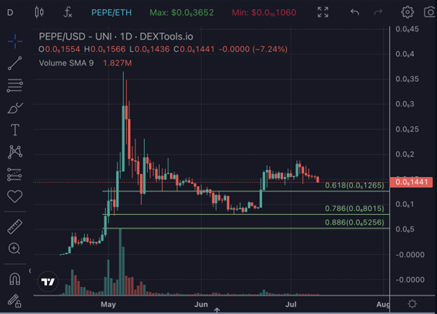 The token found support at a crucial .786 Fib Retracement in mid-June, around the $0.0000008 level. Since then, PEPE has rebounded but could not set new support above $0.0000019 last week, causing it to drop to the current $0.0000014 level;
