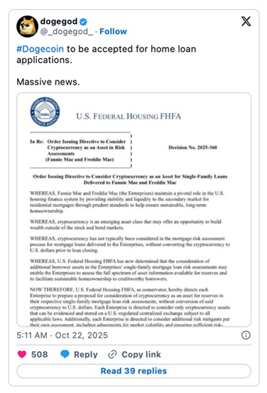 如果 DOGE 最終在美國房貸體系中獲得認可,這將不僅是這枚曾以模仿比特幣為笑點而生的代幣的一大飛躍,更是整個加密行業的重大突破。