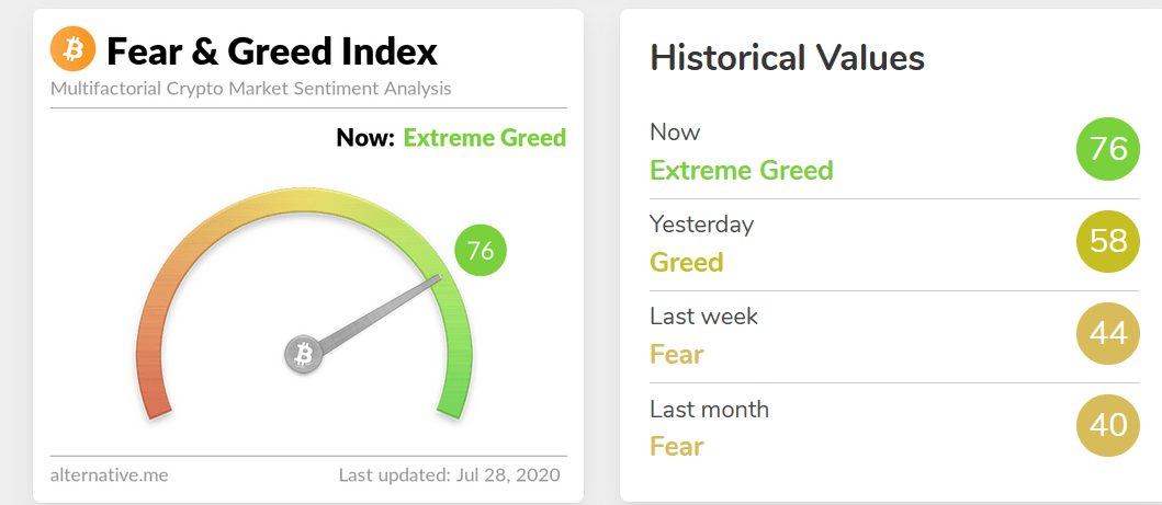 What’s more, the Crypto Fear & Greed Index is currently showing a reading of 76, or extreme greed.