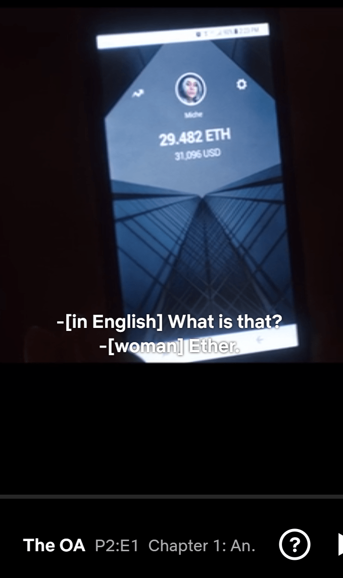The second most popular crypto by market capitalisation has been featured prominently in the second series of a Netflix original show, The OA. The first episode introduces Ether as the currency used to reward players on a fictional online puzzle game called Symphony Q.