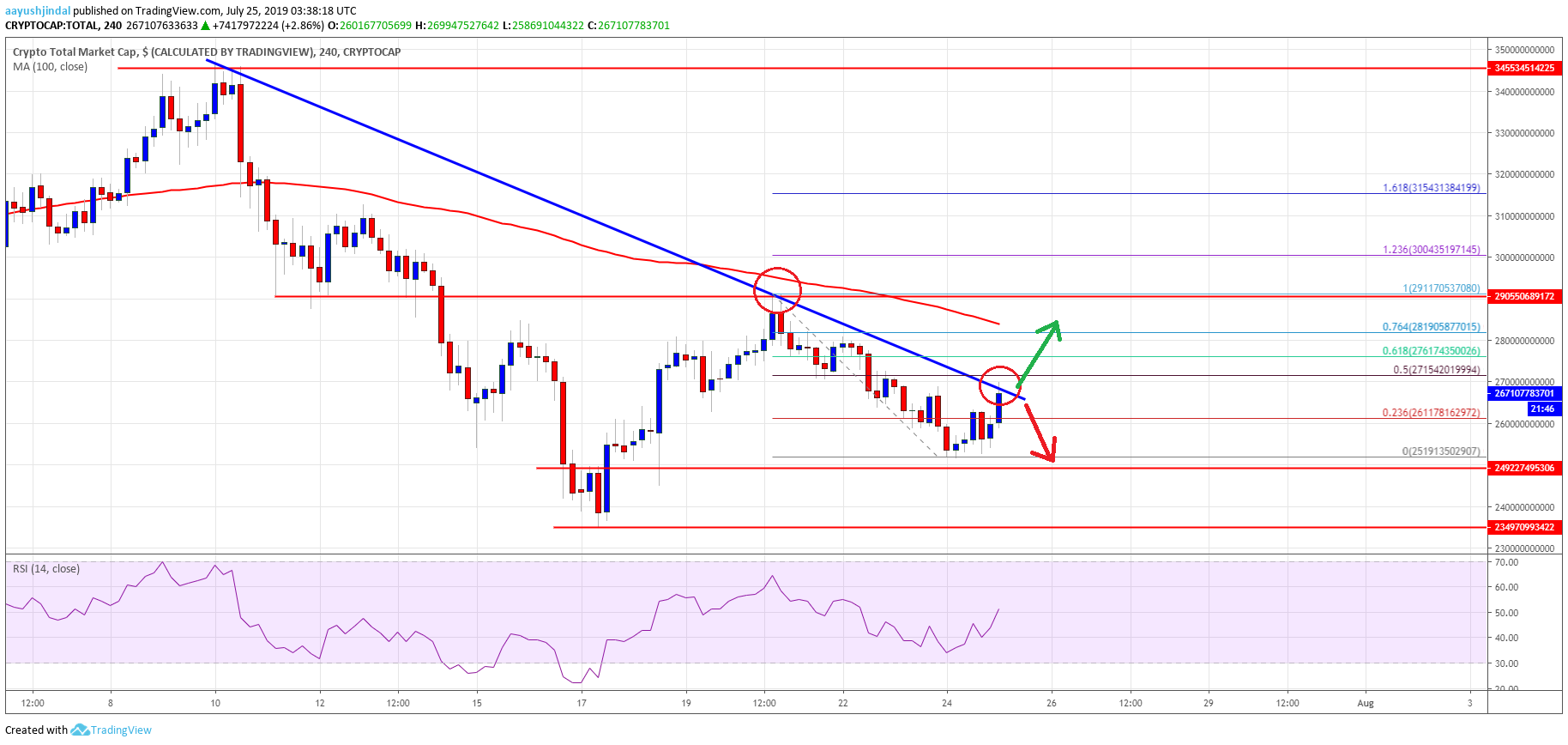 Looking at the total cryptocurrency market cap 4-hours chart, the $250.0B level acted as a decent support after a steady decline. The market cap started a decent recovery above the $260.0B resistance level. However, it seems like there is a major resistance forming near $270.0B and a connecting bearish trend line. Therefore, an upside break above $270.0B might start a significant upward move. If not, there is a risk of a fresh drop to $250.0B. Overall, it seems like there are chances of more gains in bitcoin, Ethereum, EOS, litecoin, ripple, ADA, BCH, TRX, ICX, XLM and other altcoins in the near term.
