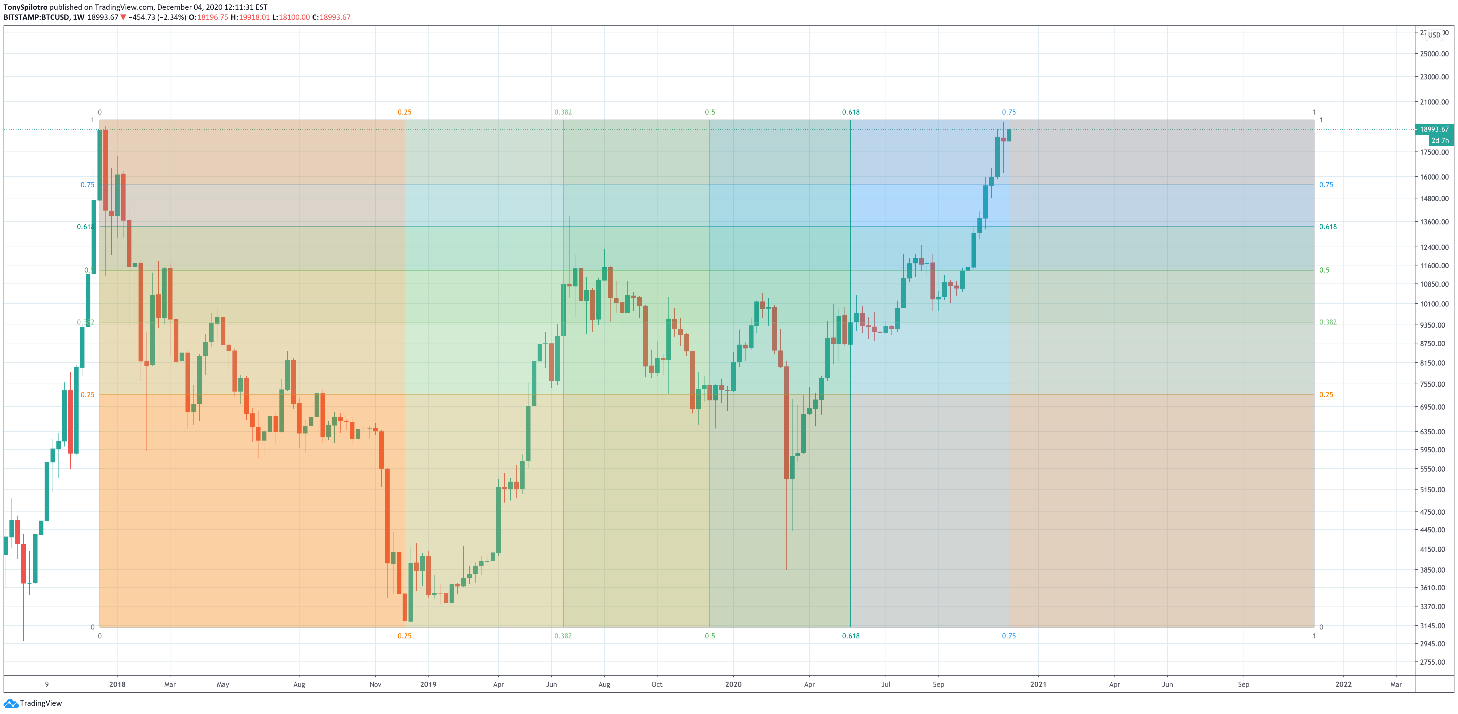In the first tool we’re examining, each Fib time zone happens to take place at a major turning point. The first was at Bitcoin’s bottom, the second was right before the 2019 blow-off top.