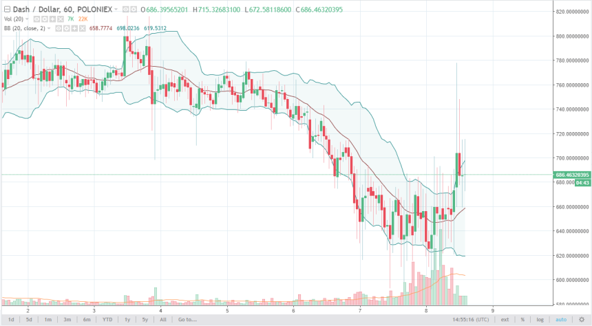 DASH continues to be very volatile, and at one point tested the $780 level, before dropping $100. Because of this, it is obvious to me that we still are trying to build a bit of a base, perhaps centered around the $650 level. Longer-term, I do think that the buyers continue to win the day, but be very cautious and add to your position slowly.