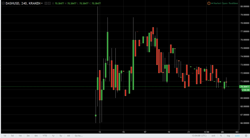 The DASH/USD market continues to be choppy, as we bounced between the $70 level on the bottom and the $73 level on the top. Currently, looks as if we are consolidating in general, and a bounce from the $70 level should send this market to higher levels. A break above the $73 level should have this market looking for the $75 handle after that. A breakdown below $70 would be very negative and should send this market down to the $69 level and then the $66 level.
