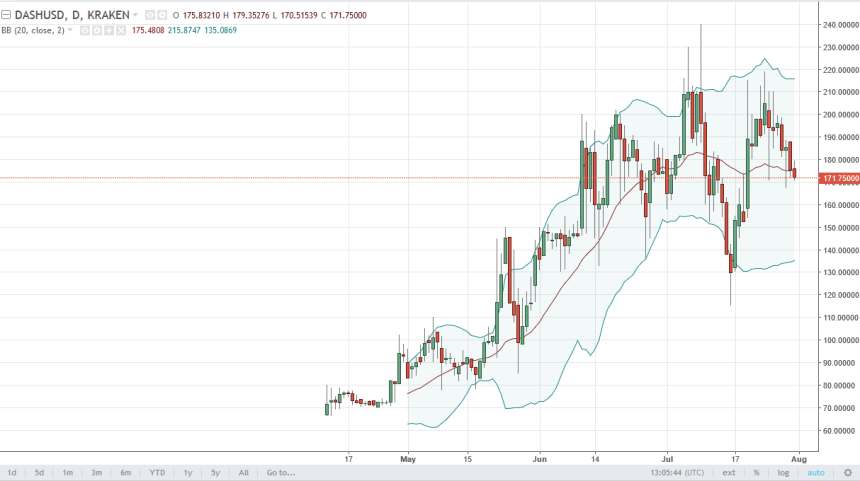 DASH continues to be volatile, as we initially tried to rally during the day on Monday, but the $180 level proved to be far too resistive. Because of this, looks as if the market will continue to be choppy and difficult to deal with overall. However, if we break above the $180 level, I’d be willing to buy this market as it should then go to the $200 level after that.