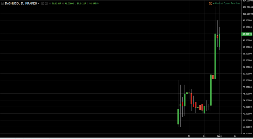 DASH rallied again during the session on Monday, reaching the $96 level. It now looks as if we are going to consolidate between the $90 level on the bottom, and perhaps somewhere near $94 as we have seen the markets struggle to stay above there. With this, looking at short-term charts that have pullbacks offering support is probably the best way to trade DASH. I don’t have any interest in shorting, but I do recognize that if we break down below the bottom of the range for the Monday session, the market could find itself falling to the $82 level rather quickly.
