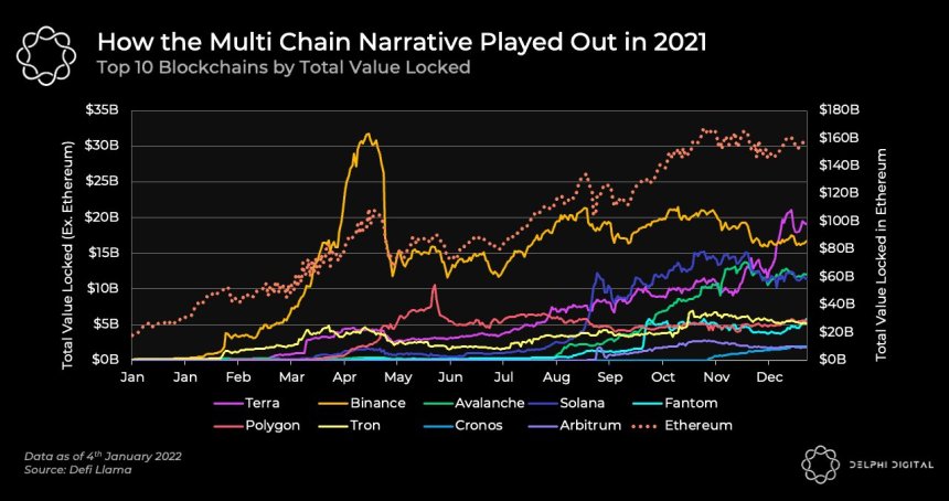 Despite its high transaction fees, and congestion issues Ethereum remained the largest network in terms of TVL during 2021 and preserved its dominance, for the time being. When analyzing the biggest protocols by TVL, it is interesting to find Lido Finance and Multichain, as Delphi Digital claimed, two platforms with interoperable and cross-chain capabilities.