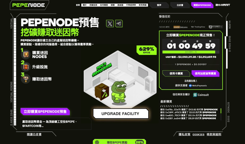 與此同時,PepeNode($PEPENODE)等新興迷因系統型代幣的熱度同步升高,顯示資金不只是「回到迷因」,而是開始尋找下一個周期的長線布局點。