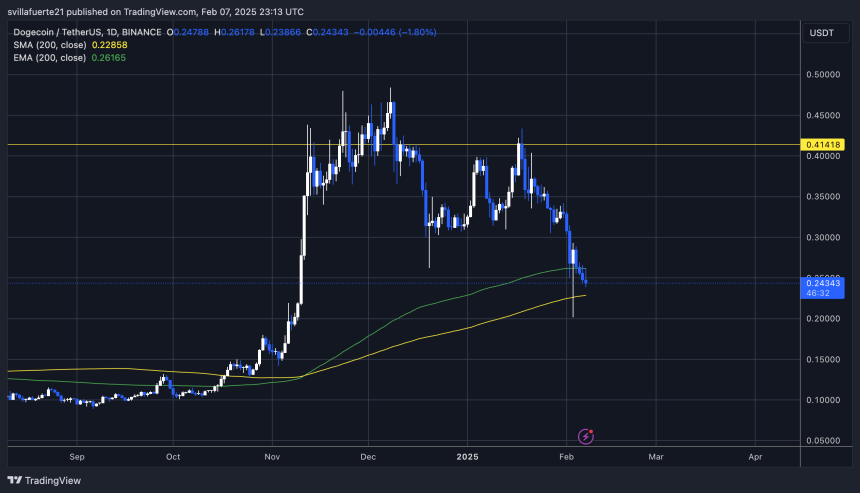 Dogecoin has faced increased volatility and selling pressure as February kicks off with uncertainty across global markets. The meme coin struggles to break above the $0.25 mark, reflecting broader concerns amid US trade war fears and macroeconomic instability. Investors remain cautious, with many waiting for clear signals before jumping back into the market. However, key on-chain data suggests that big players are taking advantage of current price levels.