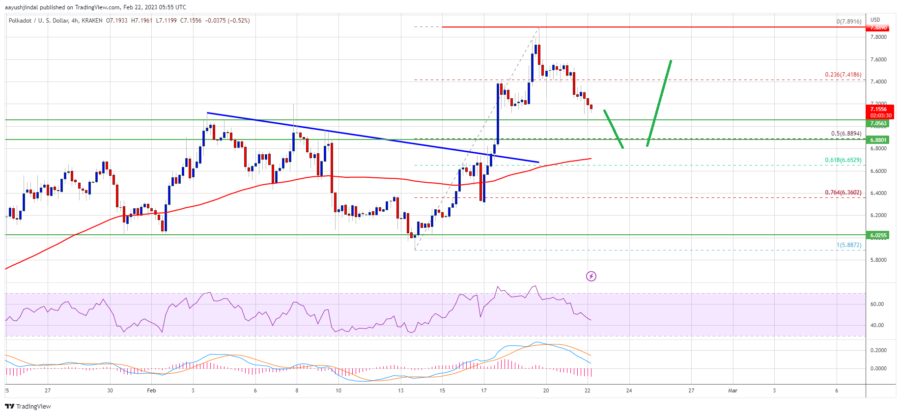 However, DOT price is trading above the $6.60 support and the 100 simple moving average (4-hours). An immediate resistance is near the $7.40 level.