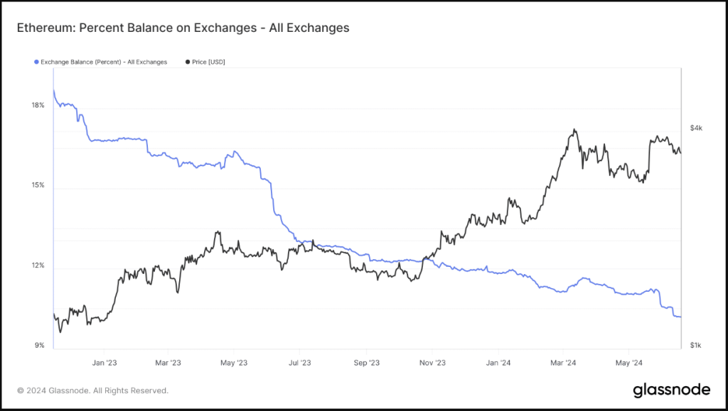 A recent study of on-chain data indicates that ETH’s balance on exchanges has dropped to its lowest level in eight years—just around 10.20%. This means that a substantial number of ETH holders are withdrawing their coins from exchanges, therefore removing them from the market for quick sale.