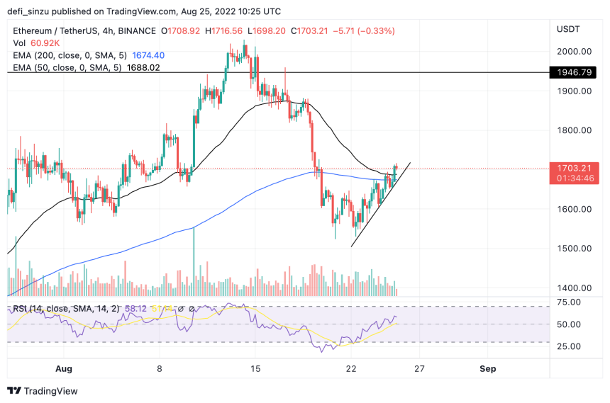 ETH is currently trading at $1,703, just above the 50 Exponential Moving Average (EMA), which corresponds to a price of $1,650 acting as support for ETH.