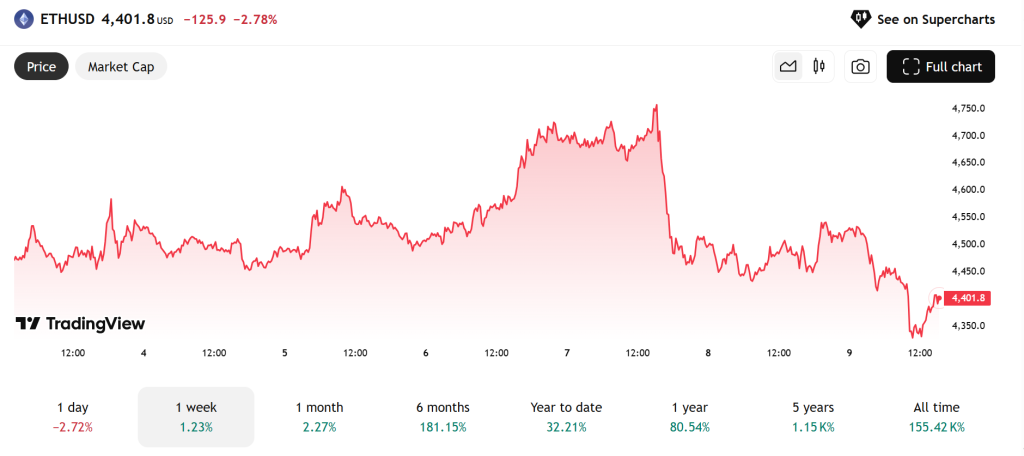 Al momento della stesura dell’articolo il prezzo di Ethereum è di 4.401 dollari.
