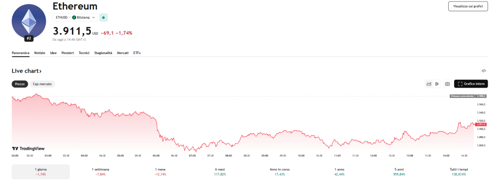 Al momento della stesura, il prezzo di Ethereum (ETH) si aggira sotto i 4.000 $, in calo di circa –2% nell’ultima settimana.