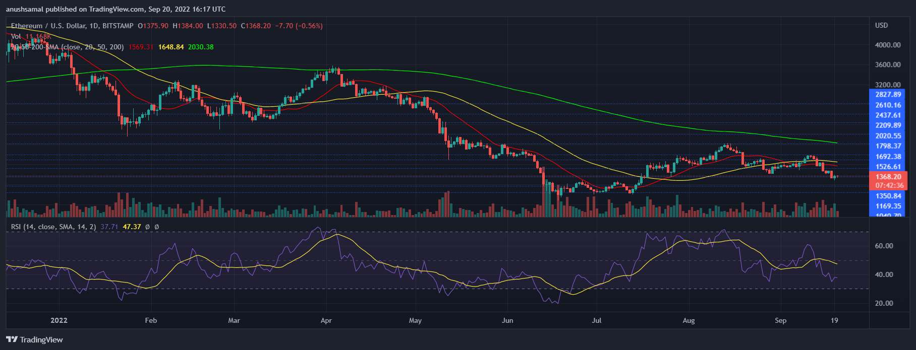 ETH was trading for $1,360 at the time of writing. Ever since Ethereum touched the $1,800 price mark, the bulls could not sustain themselves and caused the asset to tumble further.
