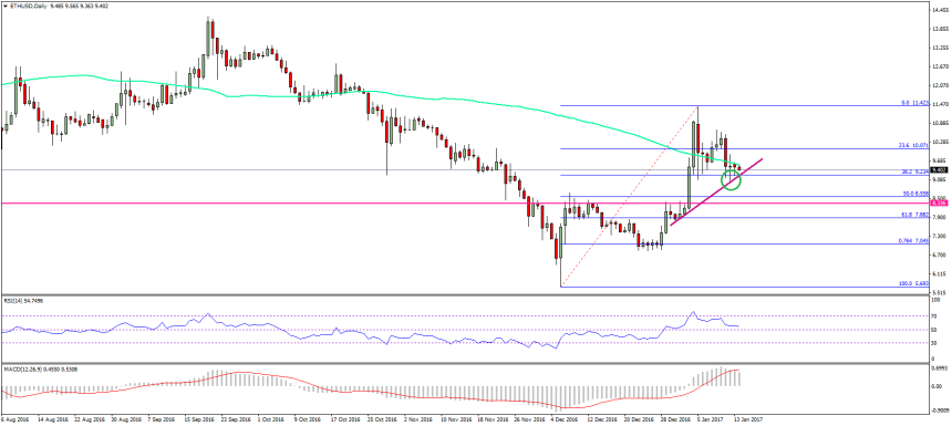 It also was a major factor of the price not able to gain pace above $10.00. At the moment, the price is trading near a major support zone. There is a tiny connecting bullish trend line formed on the daily chart (data feed via SimpleFX) of ETH/USD. It is acting as a support along with the 38.2% Fib retracement level of the last wave from the $5.69 low to $11.42 high. As long as the price is above it, there can be an attempt to trade higher once again.