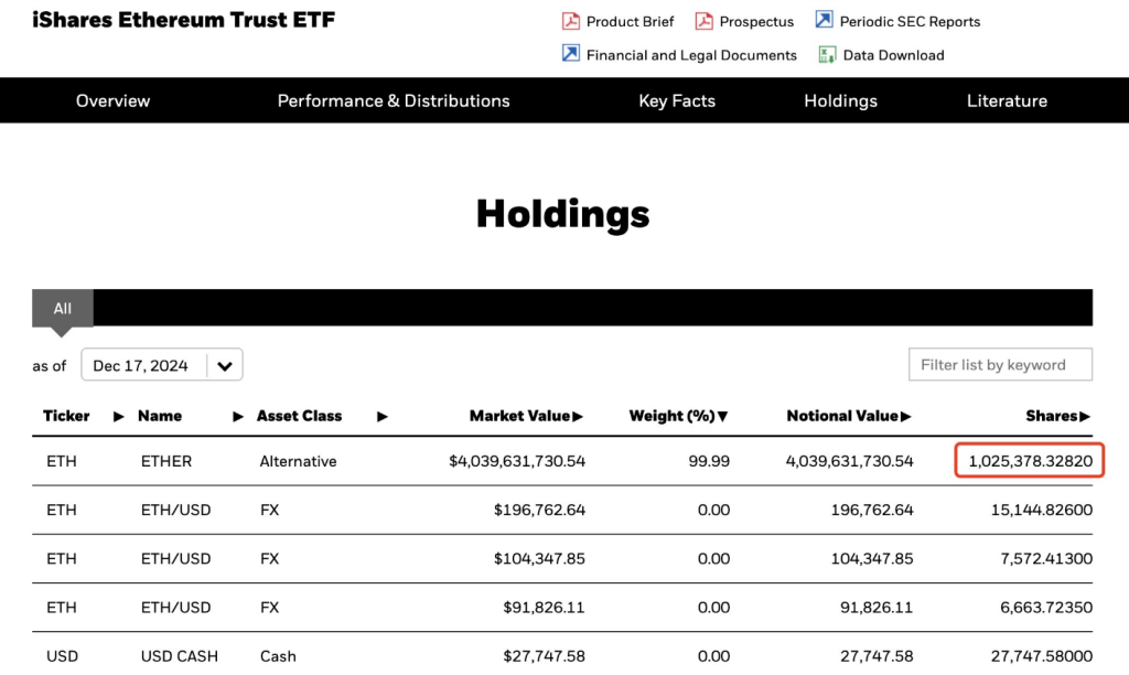BREAKING: #BlackRock’s iShares Ethereum Trust ETF now holds over 1M $ETH, totaling 1,025,378 $ETH($4.04B).https://t.co/sefS6WTlHz pic.twitter.com/kvd7KY24zQ
