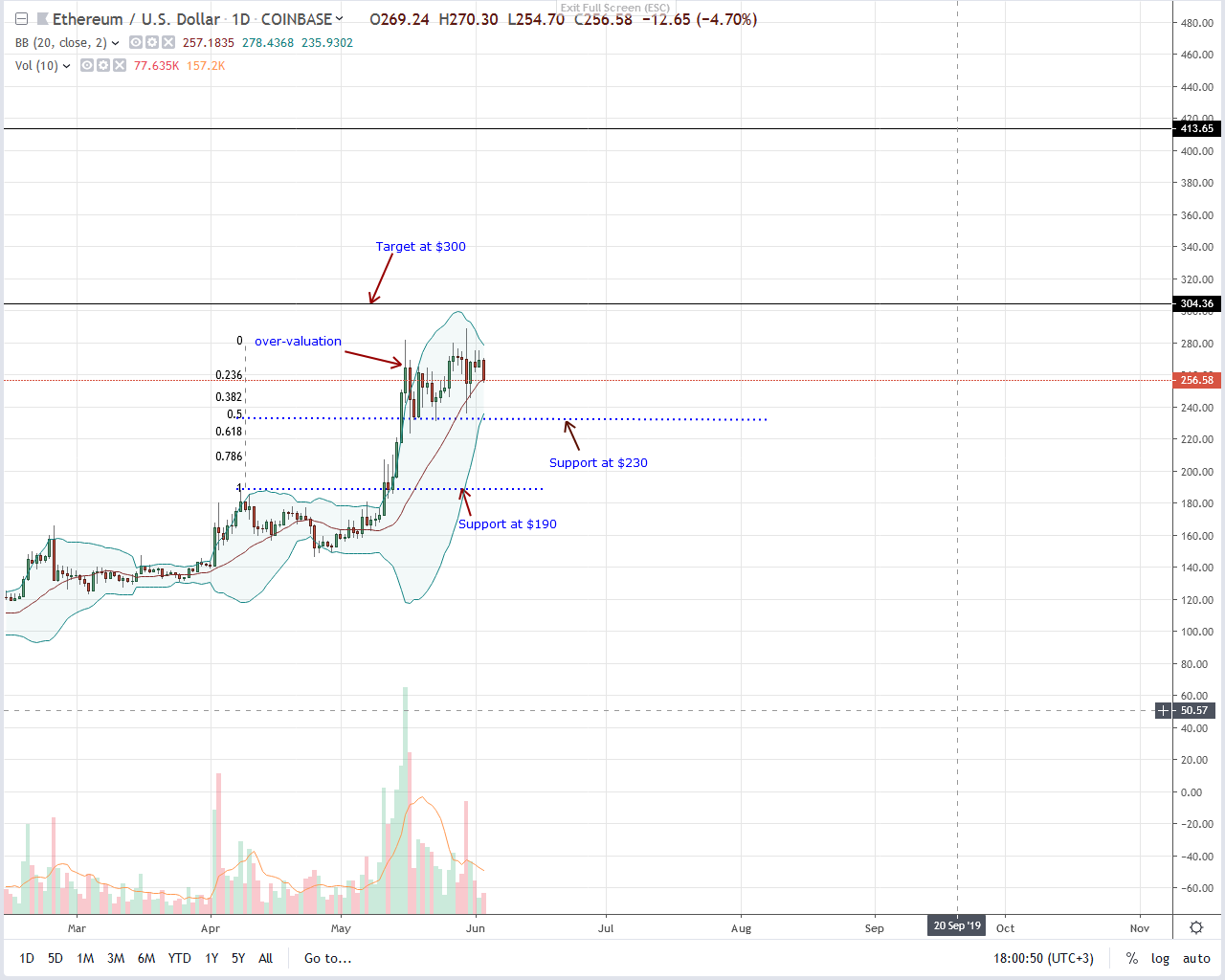 There is resistance for higher highs. In the last day, ETH is down 3.7 percent, reacting from $290 as sellers appear to press lower, forcing liquidation. For bulls to cement their position, then it is vital for prices to break free from the current consolidation, preferably at the back of high trading volumes.