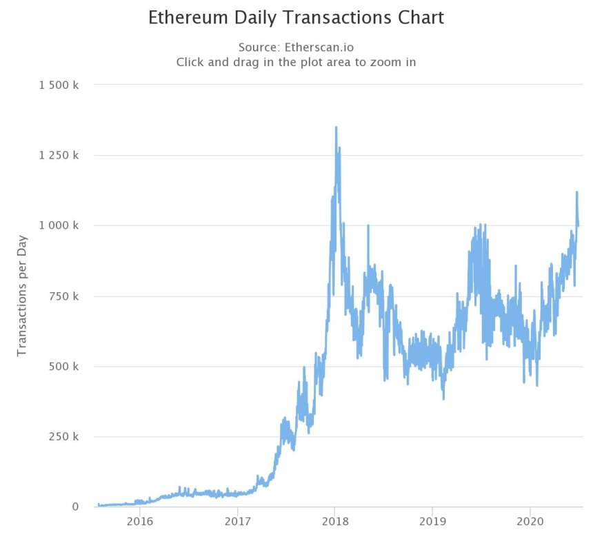 Below is a chart from Etherscan showing that the number of transactions on Ethereum is starting to near 2018’s all-time high. Late last week, there were over 1.1 million transactions in a single day; the all-time high is around 1.37 million transactions in a day.