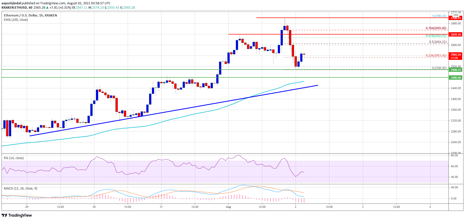 Ethereum outperformed bitcoin and rallied above the $2,550 resistance against the US Dollar. ETH price tested $2,700 and it is now correcting gains.