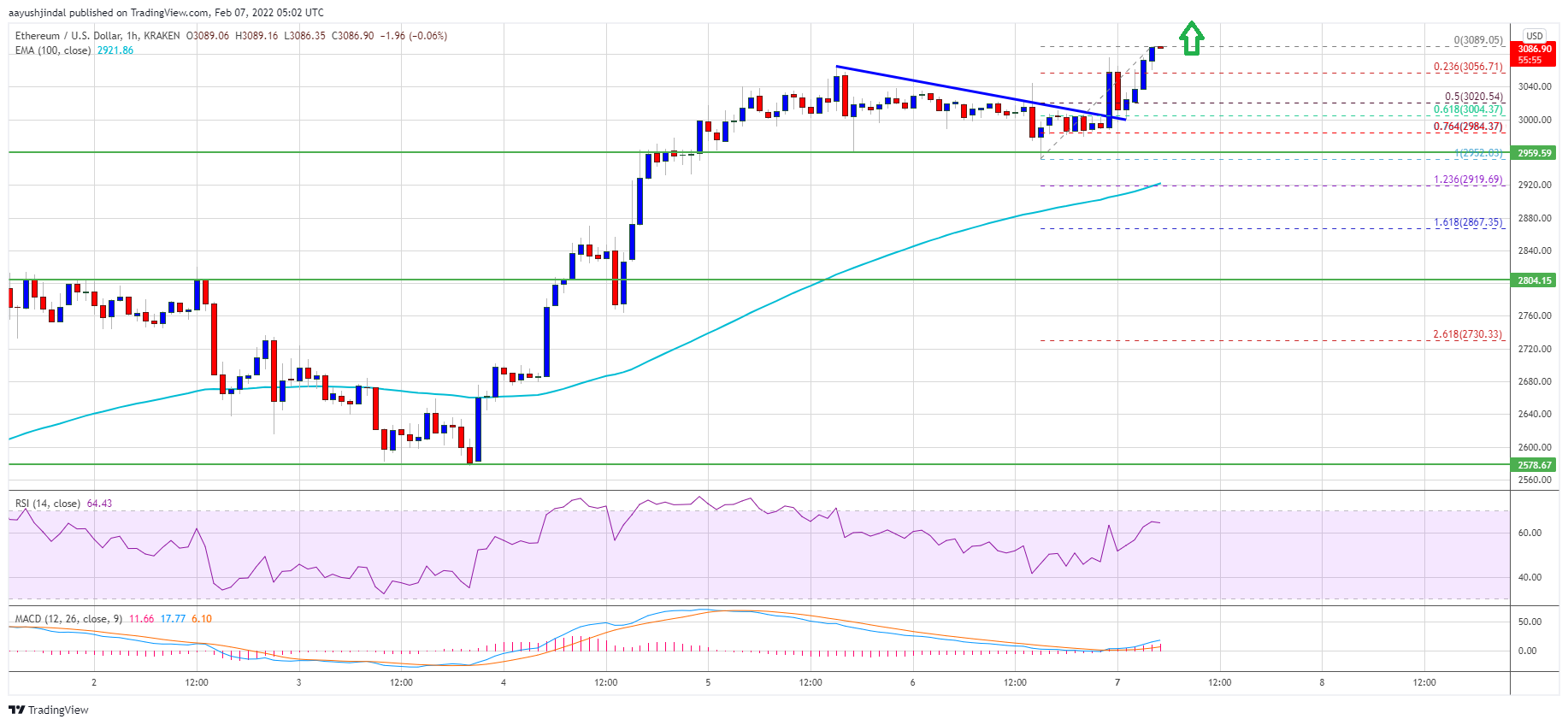 - The price is now trading above $3,000 and the 100 hourly simple moving average.