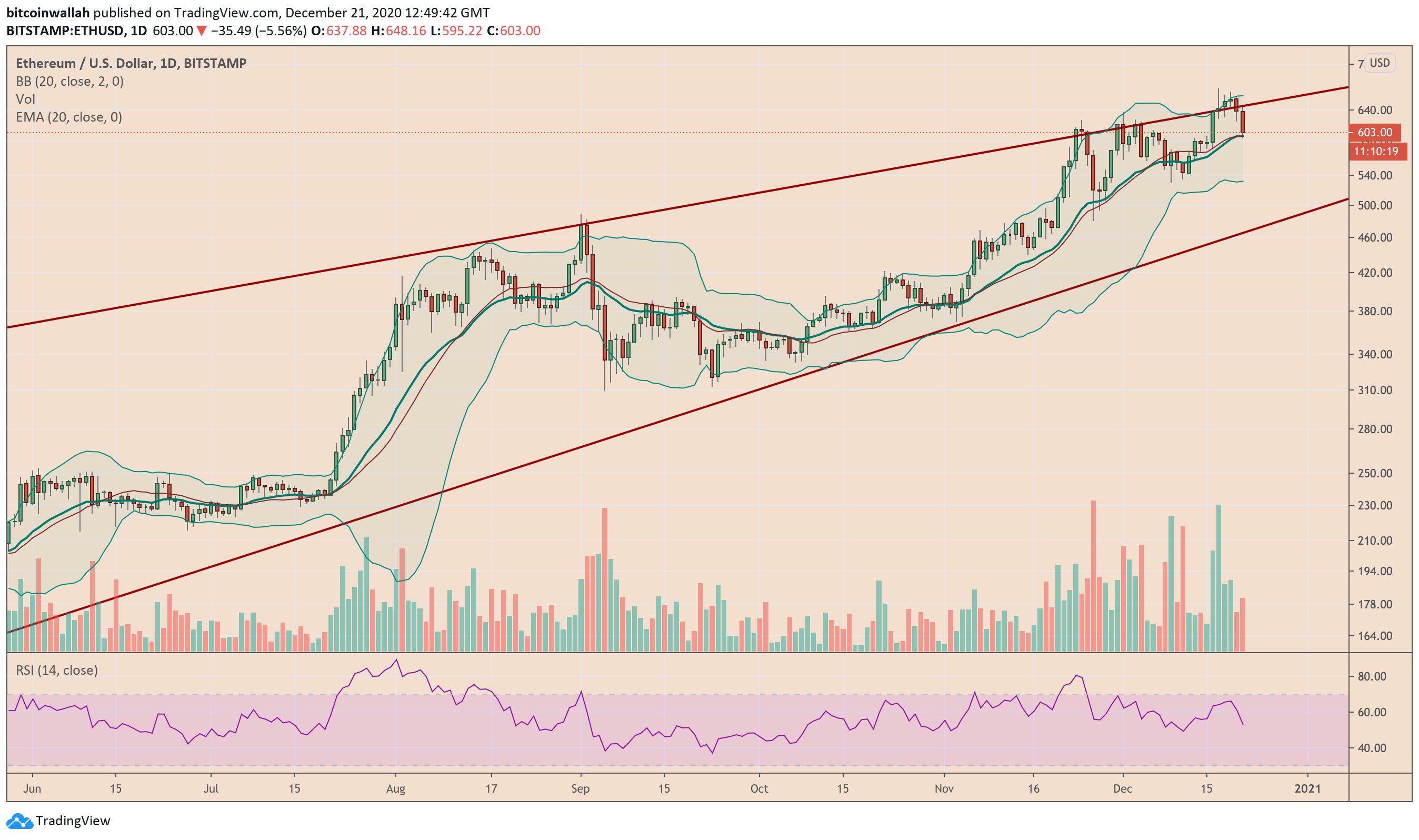 The ETH/USD exchange rate fell by more than 6 percent to $595.22 ahead of the New York opening bell. The pair’s downside move appeared a day after it logged a new year-to-date high of $676.94. While it managed to hold its gains during the Asian session, traders started securing their profits during the European hours as demand shifted back to the US dollar amid an anti-risk sentiment.