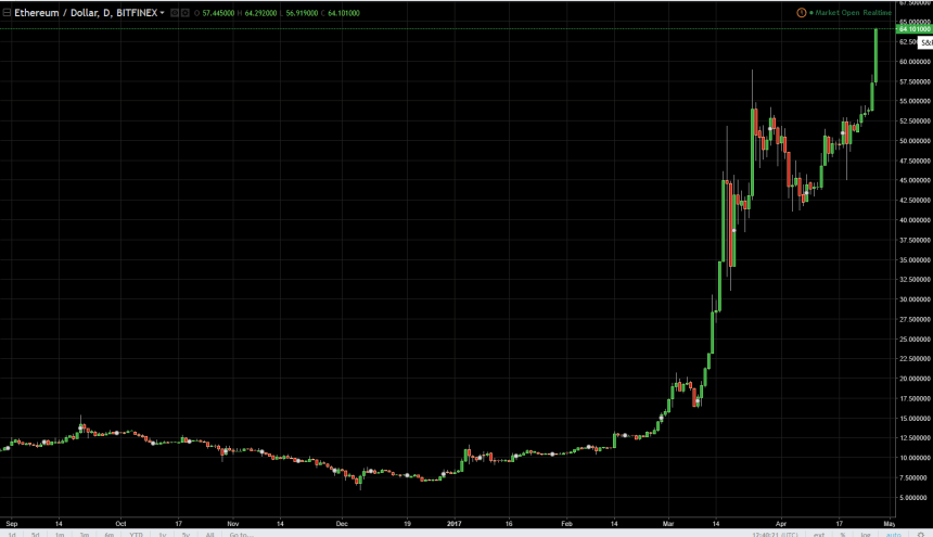 Ethereum rallied against the US dollar during the session on Thursday, breaking above the $60 level. We are now free to go much higher. Pullbacks at this point should offer value, and the $60 level now should be the beginning of fairly significant support. I have no interest in shorting, and believe that it there and will continue to go much higher.