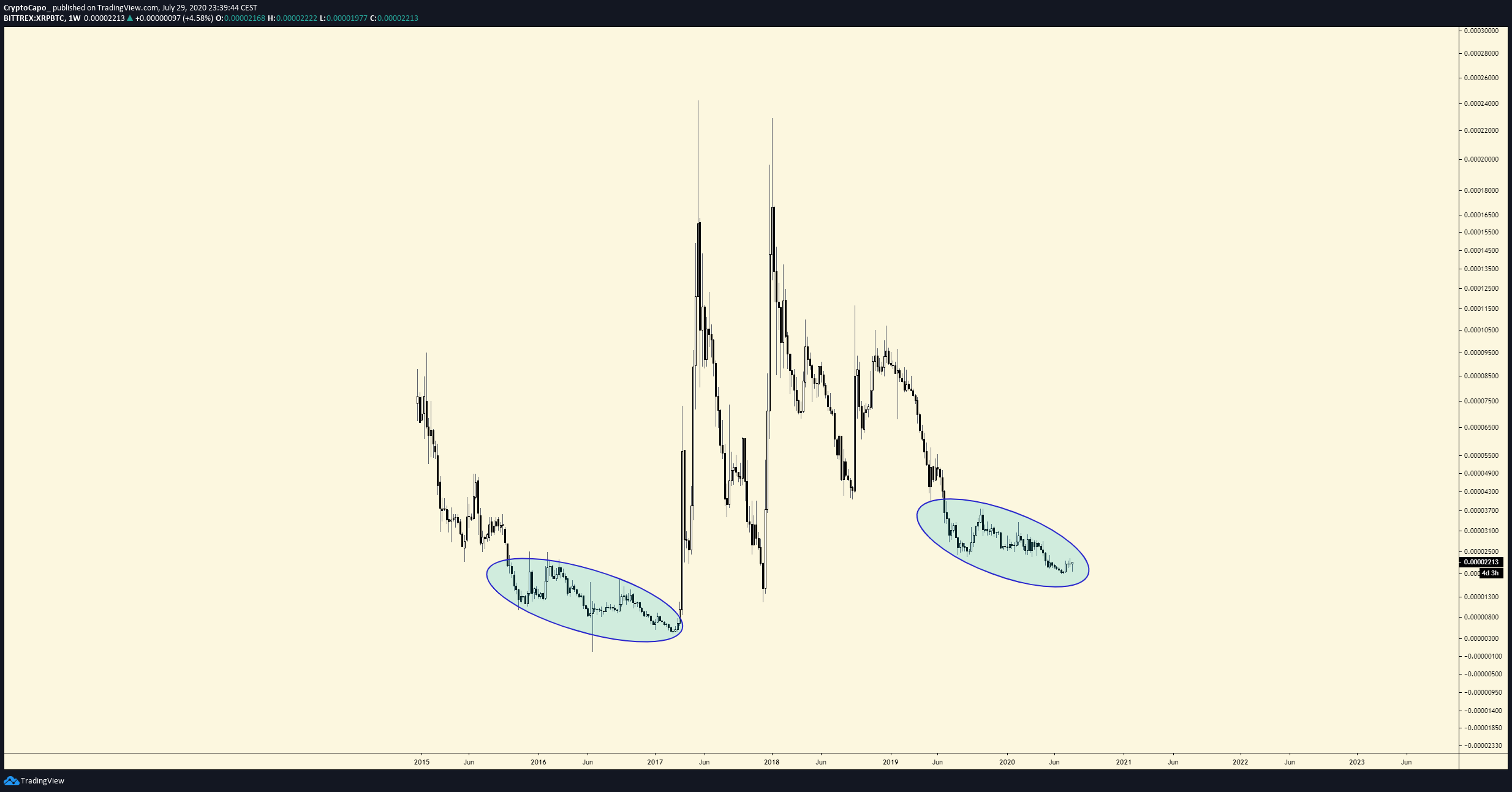 One fractal shows that the price action seen in recent months is strikingly similar to that seen against its Bitcoin trading pair in the summer months of 2017.